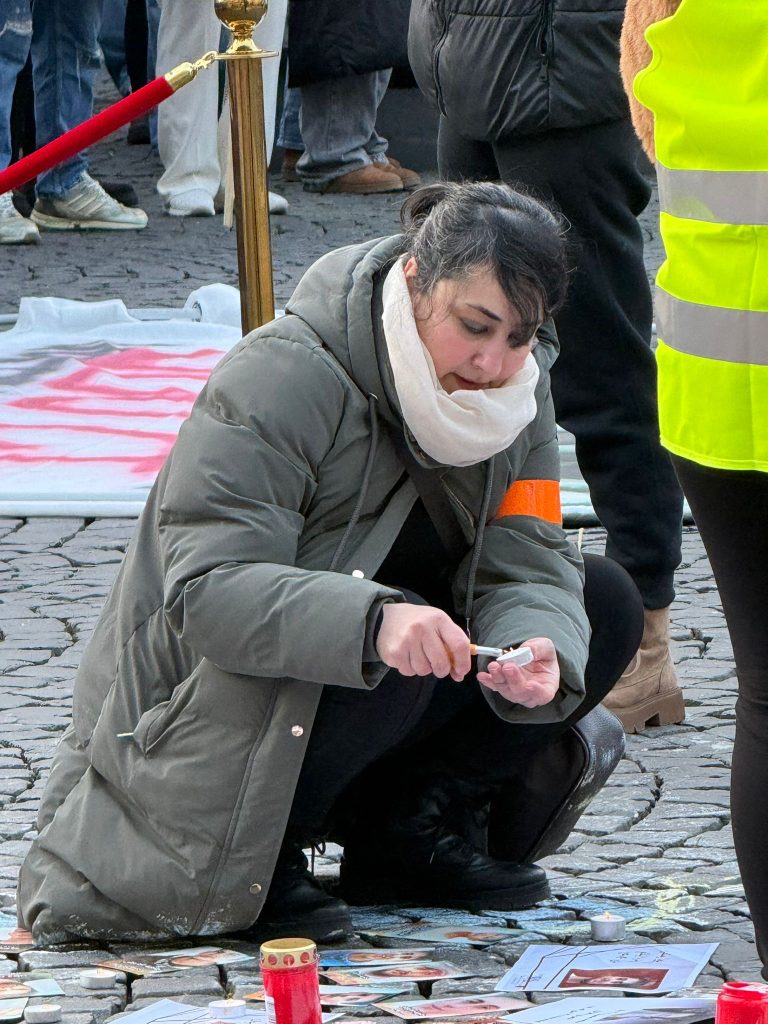 Farzaneh Ravesh zündet bei der Solidaritätskundgebung in Frankfurt Kerzen für die während der Proteste 2026 in Iran Getöteten an. Foto: Atusa